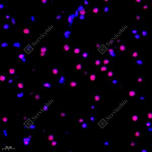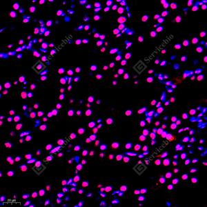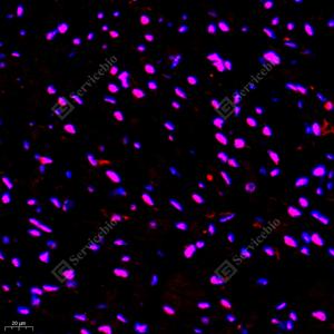 | IF检测HDAC1蛋白(货号 GB12333)(红色). 样品: 大鼠心, 4%多聚甲醛 (货号G1101) 固定12-24小时. 抗原修复: 柠檬酸抗原修复液(干粉, pH 6.0) (G1201), 高压锅均匀喷气计时2分钟. 封闭: 3% BSA(货号GC305010)的PBS溶液, 室温孵育30分钟. —抗: 1: 1000稀释, 4℃ 孵育过夜. 二抗: Cy3标记山羊抗小鼠IgG (H+L) (货号GB21301), 1: 300稀释, 室温孵育1小时. |