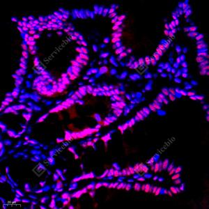| IF检测HDAC1蛋白(货号 GB12333)(红色). 样品: 人小肠癌, 4%多聚甲醛 (货号G1101) 固定12-24小时. 抗原修复: 柠檬酸抗原修复液(干粉, pH 6.0) (G1201), 高压锅均匀喷气计时2分钟. 封闭: 3% BSA(货号GC305010)的PBS溶液, 室温孵育30分钟. —抗: 1: 1000稀释, 4℃ 孵育过夜. 二抗: Cy3标记山羊抗小鼠IgG (H+L) (货号GB21301), 1: 300稀释, 室温孵育1小时. |