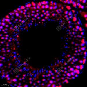| IF检测HDAC1蛋白(货号 GB12333)(红色). 样品: 大鼠睾丸, 4%多聚甲醛 (货号G1101) 固定12-24小时. 抗原修复: 柠檬酸抗原修复液(干粉, pH 6.0) (G1201), 高压锅均匀喷气计时2分钟. 封闭: 3% BSA(货号GC305010)的PBS溶液, 室温孵育30分钟. —抗: 1: 1000稀释, 4℃ 孵育过夜. 二抗: Cy3标记山羊抗小鼠IgG (H+L) (货号GB21301), 1: 300稀释, 室温孵育1小时. |
