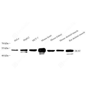 WB检测DLST蛋白(货号 GB114020). 样品: 经RIPA裂解液(货号G2002)处理的蛋白质. 封闭: 3%脱脂牛奶(货号GC310001)溶于TBST溶液, 室温孵育1小时. —抗: 1: 1000稀释, 4℃ 孵育过夜. 二抗: HRP标记山羊抗兔IgG (H+L) (货号GB23303), 1: 5000稀释, 室温孵育1小时. |
