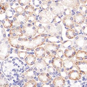 IHC检测DLST蛋白(货号 GB114020). 样品: 小鼠肾, 4%多聚甲醛 (货号G1101) 固定12-24小时. 抗原修复: 柠檬酸抗原修复液(干粉, pH 6.0) (G1201), 98℃, 20分钟. —抗: 1: 1000稀释, 4℃ 孵育过夜. 二抗: HRP标记山羊抗兔IgG (H+L) (货号GB23303), 1: 200稀释, 室温孵育1小时. |
