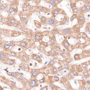 IHC检测DLST蛋白(货号 GB114020). 样品: 人肝, 4%多聚甲醛 (货号G1101) 固定12-24小时. 抗原修复: 柠檬酸抗原修复液(干粉, pH 6.0) (G1201), 98℃, 20分钟. —抗: 1: 1000稀释, 4℃ 孵育过夜. 二抗: HRP标记山羊抗兔IgG (H+L) (货号GB23303), 1: 200稀释, 室温孵育1小时. |
