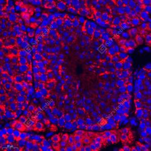 IF检测DLST蛋白(货号 GB114020)(红色). 样品: 小鼠睾丸, 4%多聚甲醛 (货号G1101) 固定12-24小时. 抗原修复: Tris-EDTA抗原修复液(pH 9.0) (G1203), 98℃, 20分钟. 封闭: 3% BSA(货号GC305010)的PBS溶液, 室温孵育30分钟. —抗: 1: 1000稀释, 4℃ 孵育过夜. 二抗: Cy3标记山羊抗兔IgG (H+L) (货号GB21303), 1: 300稀释, 室温孵育1小时. |