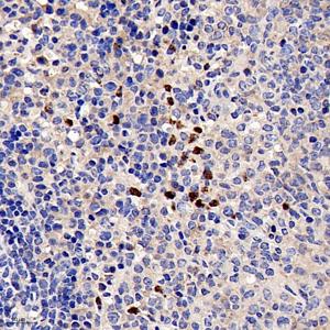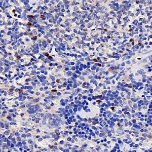 IHC检测NOX2/gp91phox蛋白(货号 GB11391). 样品: 小鼠脾, 4%多聚甲醛 (货号G1101) 固定12-24小时. 抗原修复: 柠檬酸抗原修复液(干粉, pH 6.0) (G1201), 98℃, 20分钟. —抗: 1: 200稀释, 4℃ 孵育过夜. 二抗: HRP标记山羊抗兔IgG (H+L) (货号GB23303), 1: 200稀释, 室温孵育1小时. |