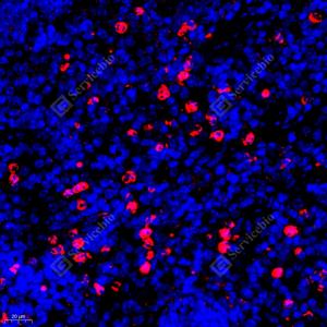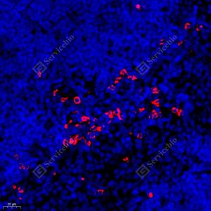 IF检测NOX2/gp91phox蛋白(货号 GB11391)(红色). 样品: 小鼠脾, 4%多聚甲醛 (货号G1101) 固定12-24小时. 抗原修复: Tris-EDTA抗原修复液(pH 9.0) (G1203), 98℃, 20分钟. 封闭: 3% BSA(货号GC305010)的PBS溶液, 室温孵育30分钟. —抗: 1: 400稀释, 4℃ 孵育过夜. 二抗: Cy3标记山羊抗兔IgG (H+L) (货号GB21303), 1: 300稀释, 室温孵育1小时. |