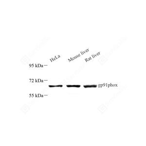 WB检测NOX2/gp91phox蛋白(货号 GB112362). 样品: 经RIPA裂解液(货号G2002)处理的蛋白质. 封闭: 3%脱脂牛奶(货号GC310001)溶于TBST溶液, 室温孵育1小时. —抗: 1: 400稀释, 4℃ 孵育过夜. 二抗: HRP标记山羊抗兔IgG (H+L) (货号GB23303), 1: 5000稀释, 室温孵育1小时. |