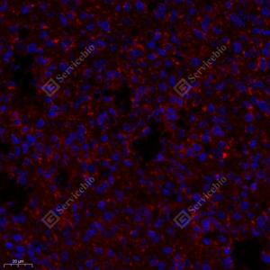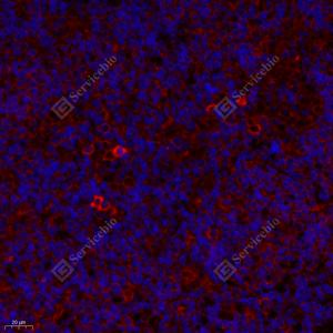 IF检测NOX2/gp91phox蛋白(货号 GB112362)(红色). 样品: 人扁桃体, 4%多聚甲醛 (货号G1101) 固定12-24小时. 抗原修复: Tris-EDTA抗原修复液(pH 9.0) (G1203), 98℃, 20分钟. 封闭: 3% BSA(货号GC305010)的PBS溶液, 室温孵育30分钟. —抗: 1: 650稀释, 4℃ 孵育过夜. 二抗: Cy3标记山羊抗兔IgG (H+L) (货号GB21303), 1: 300稀释, 室温孵育1小时. |