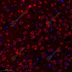 IF检测NOX2/gp91phox蛋白(货号 GB112362)(红色). 样品: 小鼠前额叶, 4%多聚甲醛 (货号G1101) 固定12-24小时. 抗原修复: Tris-EDTA抗原修复液(pH 9.0) (G1203), 98℃, 20分钟. 封闭: 3% BSA(货号GC305010)的PBS溶液, 室温孵育30分钟. —抗: 1: 650稀释, 4℃ 孵育过夜. 二抗: Cy3标记山羊抗兔IgG (H+L) (货号GB21303), 1: 300稀释, 室温孵育1小时. |