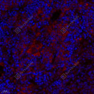 IF检测NOX2/gp91phox蛋白(货号 GB112362)(红色). 样品: 小鼠淋巴结, 4%多聚甲醛 (货号G1101) 固定12-24小时. 抗原修复: Tris-EDTA抗原修复液(pH 9.0) (G1203), 98℃, 20分钟. 封闭: 3% BSA(货号GC305010)的PBS溶液, 室温孵育30分钟. —抗: 1: 650稀释, 4℃ 孵育过夜. 二抗: Cy3标记山羊抗兔IgG (H+L) (货号GB21303), 1: 300稀释, 室温孵育1小时. |