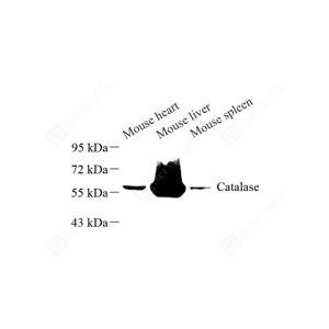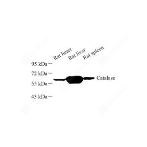 WB检测Catalase蛋白(货号 GB11681). 样品: 经RIPA裂解液(货号G2002)处理的蛋白质. 封闭: 封闭: 3%脱脂牛奶(货号GC310001)溶于TBST溶液, 室温孵育1小时. —抗: 1: 1000稀释, 4℃ 孵育过夜. 二抗: HRP标记山羊抗兔IgG (H+L) (货号GB23303), 1: 5000稀释, 室温孵育1小时. |
