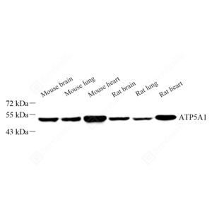 The ATP5A1 gene encodes the α subunit of mitochondrial ATP synthase which produces ATP from ADP in the presence of a proton gradient across the membrane. ATP5A1 is localized in the mitochondria and anti-ATP5A1 can be used as the loading control for mitochondrial or Complex V proteins.