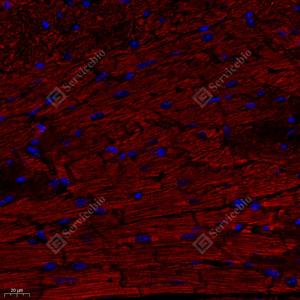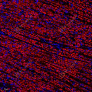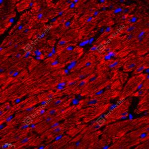 | IF检测ATP5A蛋白(货号 GB112433)(红色). 样品: 大鼠心, 4%多聚甲醛 (货号G1101) 固定12-24小时. 抗原修复: Tris-EDTA抗原修复液(pH 9.0) (G1203), 98℃, 20分钟. 封闭: 3% BSA(货号GC305010)的PBS溶液, 室温孵育30分钟. —抗: 1: 300稀释, 4℃ 孵育过夜. 二抗: Cy3标记山羊抗兔IgG (H+L) (货号GB21303), 1: 300稀释, 室温孵育1小时. |