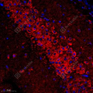 | IF检测ATP5A蛋白(货号 GB112433)(红色). 样品: 小鼠海马区, 4%多聚甲醛 (货号G1101) 固定12-24小时. 抗原修复: Tris-EDTA抗原修复液(pH 9.0) (G1203), 98℃, 20分钟. 封闭: 3% BSA(货号GC305010)的PBS溶液, 室温孵育30分钟. —抗: 1: 300稀释, 4℃ 孵育过夜. 二抗: Cy3标记山羊抗兔IgG (H+L) (货号GB21303), 1: 300稀释, 室温孵育1小时. |