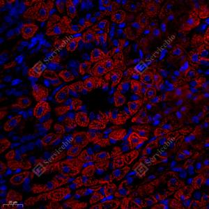 | IF检测ATP5A蛋白(货号 GB112433)(红色). 样品: 小鼠心, 4%多聚甲醛 (货号G1101) 固定12-24小时. 抗原修复: Tris-EDTA抗原修复液(pH 9.0) (G1203), 98℃, 20分钟. 封闭: 3% BSA(货号GC305010)的PBS溶液, 室温孵育30分钟. —抗: 1: 300稀释, 4℃ 孵育过夜. 二抗: Cy3标记山羊抗兔IgG (H+L) (货号GB21303), 1: 300稀释, 室温孵育1小时. |