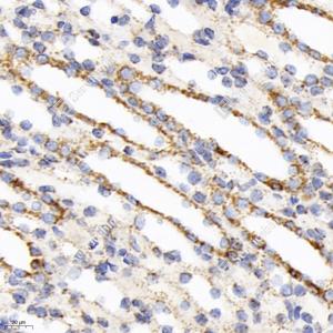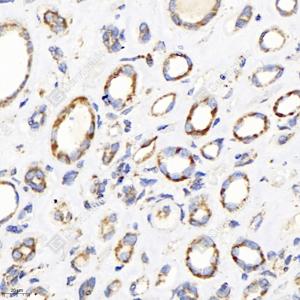 IHC检测Pyruvate Dehydrogenase E2蛋白(货号 GB113649). 样品: 人肾, 4%多聚甲醛 (货号G1101) 固定12-24小时. 抗原修复: 柠檬酸抗原修复液(干粉, pH 6.0) (G1201), 98℃, 20分钟. —抗: 1: 1000稀释, 4℃ 孵育过夜. 二抗: HRP标记山羊抗兔IgG (H+L) (货号GB23303), 1: 200稀释, 室温孵育1小时. |