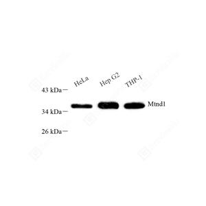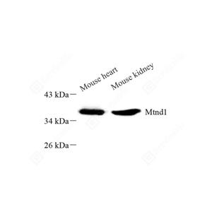WB检测MT-ND1蛋白(货号 GB113284). 样品: 经RIPA裂解液(货号G2002)处理的蛋白质. 封闭: 3%脱脂牛奶(货号GC310001)溶于TBST溶液, 室温孵育1小时. —抗: 1: 1000稀释, 4℃ 孵育过夜. 二抗: HRP标记山羊抗兔IgG (H+L) (货号GB23303), 1: 5000稀释, 室温孵育1小时. |