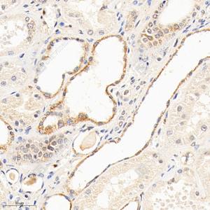 IHC检测MT-ND1蛋白(货号 GB113284). 样品: 人肾, 4%多聚甲醛 (货号G1101) 固定12-24小时. 抗原修复: 柠檬酸抗原修复液(干粉, pH 6.0) (G1201), 高压锅均匀喷气计时2分钟. —抗: 1: 1000稀释, 4℃ 孵育过夜. 二抗: HRP标记山羊抗兔IgG (H+L) (货号GB23303), 1: 200稀释, 室温孵育1小时. |