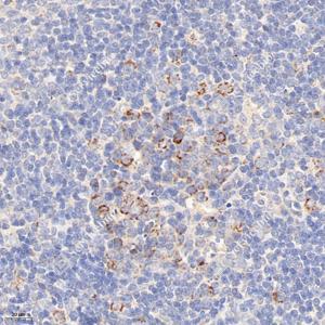 IHC检测MT-ND1蛋白(货号 GB113284). 样品: 小鼠脾, 4%多聚甲醛 (货号G1101) 固定12-24小时. 抗原修复: 柠檬酸抗原修复液(干粉, pH 6.0) (G1201), 高压锅均匀喷气计时2分钟. —抗: 1: 1000稀释, 4℃ 孵育过夜. 二抗: HRP标记山羊抗兔IgG (H+L) (货号GB23303), 1: 200稀释, 室温孵育1小时. |