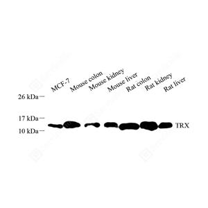 WB检测Thioredoxin/TRX蛋白(货号 GB11957). 样品: 经RIPA裂解液(货号G2002)处理的蛋白质. 封闭: 封闭: 3%脱脂牛奶(货号GC310001)溶于TBST溶液, 室温孵育1小时. —抗: 1: 500稀释, 4℃ 孵育过夜. 二抗: HRP标记山羊抗兔IgG (H+L) (货号GB23303), 1: 5000稀释, 室温孵育1小时. |
