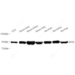 ACO2(aconitate hydratase, mitochondrial) is also named as citrate hydro-lyase and belongs to the aconitase/IPM isomerase family. It plays a key function in cellular energy production, and loss of its activity has a major impact on cellular and organismal survival. Western blot shows two bands of 83 kDa and 40 kDa. The 40 kDa fragment decreases with age and oxidative stress, whereas other fragmentation products with molecular weights between 40 and 83 kDa increased with age and MnSOD(mitochondrial manganese superoxide dismutase) deficiency. Defects in ACO2 are the cause of infantile cerebellar-retinal degeneration (ICRD).