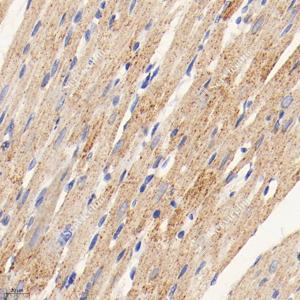 IHC检测Aconitase 2蛋白(货号 GB113832). 样品: 大鼠心, 4%多聚甲醛 (货号G1101) 固定12-24小时. 抗原修复: 柠檬酸抗原修复液(干粉, pH 6.0) (G1201), 98℃, 20分钟. —抗: 1: 500稀释, 4℃ 孵育过夜. 二抗: HRP标记山羊抗兔IgG (H+L) (货号GB23303), 1: 200稀释, 室温孵育1小时. |