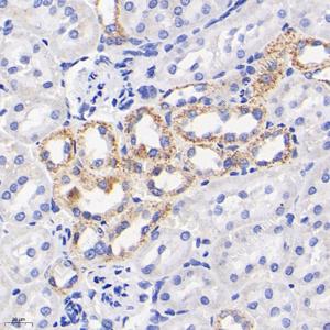 IHC检测Aconitase 2蛋白(货号 GB113832). 样品: 大鼠肾, 4%多聚甲醛 (货号G1101) 固定12-24小时. 抗原修复: 柠檬酸抗原修复液(干粉, pH 6.0) (G1201), 98℃, 20分钟. —抗: 1: 500稀释, 4℃ 孵育过夜. 二抗: HRP标记山羊抗兔IgG (H+L) (货号GB23303), 1: 200稀释, 室温孵育1小时. |