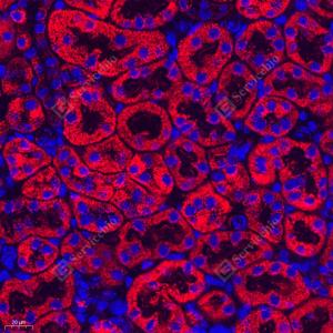IF检测Aconitase 2蛋白(货号 GB113832)(红色). 样品: 小鼠肾, 4%多聚甲醛 (货号G1101) 固定12-24小时. 抗原修复: Tris-EDTA抗原修复液(pH 9.0) (G1203), 98℃, 20分钟. 封闭: 3% BSA(货号GC305010)的PBS溶液, 室温孵育30分钟. —抗: 1: 300稀释, 4℃ 孵育过夜. 二抗: Cy3标记山羊抗兔IgG (H+L) (货号GB21303), 1: 300稀释, 室温孵育1小时. |