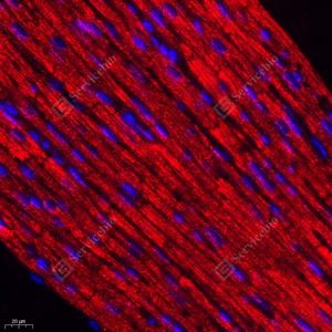 IF检测Aconitase 2蛋白(货号 GB113832)(红色). 样品: 大鼠心, 4%多聚甲醛 (货号G1101) 固定12-24小时. 抗原修复: Tris-EDTA抗原修复液(pH 9.0) (G1203), 98℃, 20分钟. 封闭: 3% BSA(货号GC305010)的PBS溶液, 室温孵育30分钟. —抗: 1: 300稀释, 4℃ 孵育过夜. 二抗: Cy3标记山羊抗兔IgG (H+L) (货号GB21303), 1: 300稀释, 室温孵育1小时. |