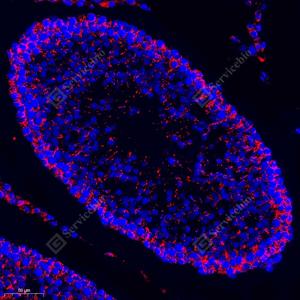 IF检测Aconitase 2蛋白(货号 GB113832)(红色). 样品: 大鼠睾丸, 4%多聚甲醛 (货号G1101) 固定12-24小时. 抗原修复: Tris-EDTA抗原修复液(pH 9.0) (G1203), 98℃, 20分钟. 封闭: 3% BSA(货号GC305010)的PBS溶液, 室温孵育30分钟. —抗: 1: 300稀释, 4℃ 孵育过夜. 二抗: Cy3标记山羊抗兔IgG (H+L) (货号GB21303), 1: 300稀释, 室温孵育1小时. |