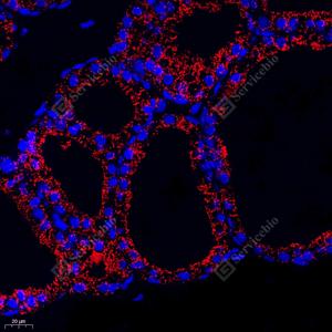 IF检测Aconitase 2蛋白(货号 GB113832)(红色). 样品: 大鼠甲状腺, 4%多聚甲醛 (货号G1101) 固定12-24小时. 抗原修复: Tris-EDTA抗原修复液(pH 9.0) (G1203), 98℃, 20分钟. 封闭: 3% BSA(货号GC305010)的PBS溶液, 室温孵育30分钟. —抗: 1: 300稀释, 4℃ 孵育过夜. 二抗: Cy3标记山羊抗兔IgG (H+L) (货号GB21303), 1: 300稀释, 室温孵育1小时. |