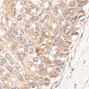 IHC检测MCTS1/MCT-1蛋白(货号 GB114599). 样品: 人乳腺癌, 4%多聚甲醛 (货号G1101) 固定12-24小时. 抗原修复: 柠檬酸抗原修复液(干粉, pH 6.0) (G1201), 98℃, 20分钟. —抗: 1: 500稀释, 4℃ 孵育过夜. 二抗: HRP标记山羊抗兔IgG (H+L) (货号GB23303), 1: 200稀释, 室温孵育1小时. |