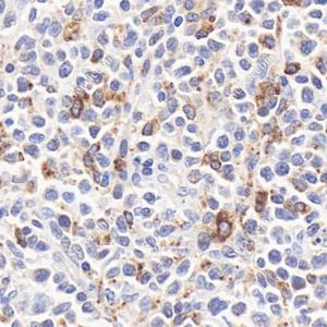 IHC检测MCTS1/MCT-1蛋白(货号 GB114599). 样品: 人T细胞淋巴瘤, 4%多聚甲醛 (货号G1101) 固定12-24小时. 抗原修复: 柠檬酸抗原修复液(干粉, pH 6.0) (G1201), 98℃, 20分钟. —抗: 1: 500稀释, 4℃ 孵育过夜. 二抗: HRP标记山羊抗兔IgG (H+L) (货号GB23303), 1: 200稀释, 室温孵育1小时. |