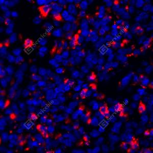 IF检测MCTS1/MCT-1蛋白(货号 GB114599)(红色). 样品: 人T细胞淋巴瘤, 4%多聚甲醛 (货号G1101) 固定12-24小时. 抗原修复: Tris-EDTA抗原修复液(pH 9.0) (G1203), 98℃, 20分钟. 封闭: 3% BSA(货号GC305010)的PBS溶液, 室温孵育30分钟. —抗: 1: 500稀释, 4℃ 孵育过夜. 二抗: Cy3标记山羊抗兔IgG (H+L) (货号GB21303), 1: 300稀释, 室温孵育1小时. |