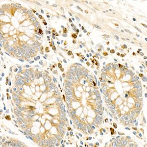 IHC检测NCF1/p47-phox蛋白(货号 GB11724). 样品: 人结肠, 4%多聚甲醛 (货号G1101) 固定12-24小时. 抗原修复: 柠檬酸抗原修复液(干粉, pH 6.0) (G1201), 98℃, 20分钟. —抗: 1: 400稀释, 4℃ 孵育过夜. 二抗: HRP标记山羊抗兔IgG (H+L) (货号GB23303), 1: 200稀释, 室温孵育1小时. |