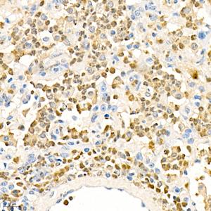 IHC检测NCF1/p47-phox蛋白(货号 GB11724). 样品: 小鼠肺炎, 4%多聚甲醛 (货号G1101) 固定12-24小时. 抗原修复: 柠檬酸抗原修复液(干粉, pH 6.0) (G1201), 98℃, 20分钟. —抗: 1: 400稀释, 4℃ 孵育过夜. 二抗: HRP标记山羊抗兔IgG (H+L) (货号GB23303), 1: 200稀释, 室温孵育1小时. |