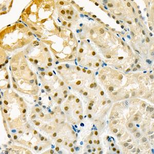 IHC检测ADK蛋白(货号 GB112419). 样品: 小鼠肾, 4%多聚甲醛 (货号G1101) 固定12-24小时. 抗原修复: 柠檬酸抗原修复液(干粉, pH 6.0) (G1201), 98℃, 20分钟. —抗: 1: 300稀释, 4℃ 孵育过夜. 二抗: HRP标记山羊抗兔IgG (H+L) (货号GB23303), 1: 200稀释, 室温孵育1小时. |