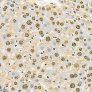 IHC检测ADK蛋白(货号 GB112419). 样品: 小鼠肝, 4%多聚甲醛 (货号G1101) 固定12-24小时. 抗原修复: 柠檬酸抗原修复液(干粉, pH 6.0) (G1201), 98℃, 20分钟. —抗: 1: 300稀释, 4℃ 孵育过夜. 二抗: HRP标记山羊抗兔IgG (H+L) (货号GB23303), 1: 200稀释, 室温孵育1小时. |