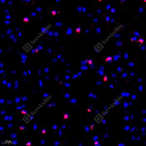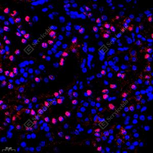 IF检测ADK蛋白(货号 GB112419)(红色). 样品: 小鼠脑, 4%多聚甲醛 (货号G1101) 固定12-24小时. 抗原修复: Tris-EDTA抗原修复液(pH 9.0) (G1203), 98℃, 20分钟. 封闭: 3% BSA(货号GC305010)的PBS溶液, 室温孵育30分钟. —抗: 1: 300稀释, 4℃ 孵育过夜. 二抗: Cy3标记山羊抗兔IgG (H+L) (货号GB21303), 1: 300稀释, 室温孵育1小时. |