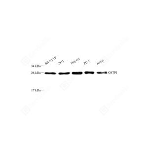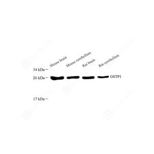 WB检测GST3/GST pi蛋白(货号 GB111885). 样品: 经RIPA裂解液(货号G2002)处理的蛋白质. 封闭: 3%脱脂牛奶(货号GC310001)溶于TBST溶液, 室温孵育1小时. —抗: 1: 1000稀释, 4℃ 孵育过夜. 二抗: HRP标记山羊抗兔IgG (H+L) (货号GB23303), 1: 5000稀释, 室温孵育1小时. |