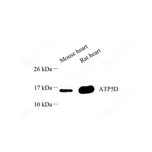 WB检测ATP5D蛋白(货号 GB111345). 样品: 经RIPA裂解液(货号G2002)处理的蛋白质. 封闭: 封闭: 3%脱脂牛奶(货号GC310001)溶于TBST溶液, 室温孵育1小时. —抗: 1: 500稀释, 4℃ 孵育过夜. 二抗: HRP标记山羊抗兔IgG (H+L) (货号GB23303), 1: 5000稀释, 室温孵育1小时. |