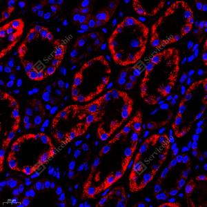 IF检测ETFA蛋白(货号 GB113834)(红色). 样品: 人肾, 4%多聚甲醛 (货号G1101) 固定12-24小时. 抗原修复: Tris-EDTA抗原修复液(pH 9.0) (G1203), 98℃, 20分钟. 封闭: 3% BSA(货号GC305010)的PBS溶液, 室温孵育30分钟. —抗: 1: 800稀释, 4℃ 孵育过夜. 二抗: Cy3标记山羊抗兔IgG (H+L) (货号GB21303), 1: 300稀释, 室温孵育1小时. |