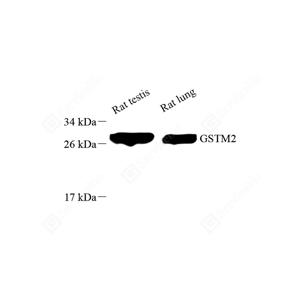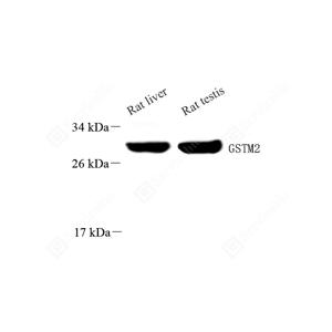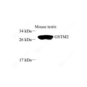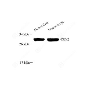 WB检测GSTM2蛋白(货号 GB113127). 样品: 经RIPA裂解液(货号G2002)处理的蛋白质. 封闭: 3%脱脂牛奶(货号GC310001)溶于TBST溶液, 室温孵育1小时. —抗: 1: 2000稀释, 4℃ 孵育过夜. 二抗: HRP标记山羊抗兔IgG (H+L) (货号GB23303), 1: 5000稀释, 室温孵育1小时. |