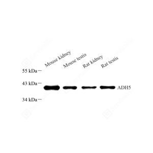 WB检测ADH5蛋白(货号 GB112624). 样品: 经RIPA裂解液(货号G2002)处理的蛋白质. 封闭: 封闭: 3%脱脂牛奶(货号GC310001)溶于TBST溶液, 室温孵育1小时. —抗: 1: 1000稀释, 4℃ 孵育过夜. 二抗: HRP标记山羊抗兔IgG (H+L) (货号GB23303), 1: 5000稀释, 室温孵育1小时. |