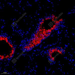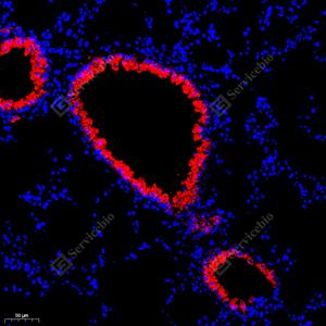 IF检测ATP6V1C2蛋白(货号 GB111599)(红色). 样品: 小鼠肺, 4%多聚甲醛 (货号G1101) 固定12-24小时. 抗原修复: Tris-EDTA抗原修复液(pH 9.0) (G1203), 98℃, 20分钟. 封闭: 3% BSA(货号GC305010)的PBS溶液, 室温孵育30分钟. —抗: 1: 200稀释, 4℃ 孵育过夜. 二抗: Cy3标记山羊抗兔IgG (H+L) (货号GB21303), 1: 300稀释, 室温孵育1小时. |