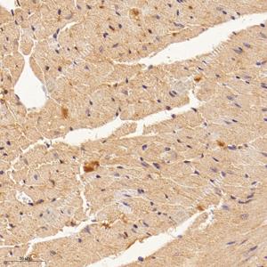 IHC检测B3GALNT1蛋白(货号 GB115200). 样品: 小鼠心, 4%多聚甲醛 (货号G1101) 固定12-24小时. 抗原修复: Tris-EDTA抗原修复液(pH 9.0) (G1203), 98℃, 20分钟. —抗: 1: 700稀释, 4℃ 孵育过夜. 二抗: HRP标记山羊抗兔IgG (H+L) (货号GB23303), 1: 200稀释, 室温孵育1小时. |