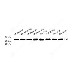 WB检测Carbonic anhydrase 2/CA2蛋白(货号 GB112426). 样品: 经RIPA裂解液(货号G2002)处理的蛋白质. 封闭: 封闭: 3%脱脂牛奶(货号GC310001)溶于TBST溶液, 室温孵育1小时. —抗: 1: 3000稀释, 4℃ 孵育过夜. 二抗: HRP标记山羊抗兔IgG (H+L) (货号GB23303), 1: 5000稀释, 室温孵育1小时. |