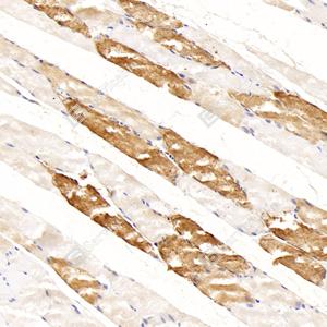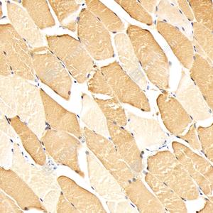 IHC检测Carbonic Anhydrase 3/CA3蛋白(货号 GB113775). 样品: 人骨骼肌, 4%多聚甲醛 (货号G1101) 固定12-24小时. 抗原修复: 柠檬酸抗原修复液(干粉, pH 6.0) (G1201), 98℃, 20分钟. —抗: 1: 500稀释, 4℃ 孵育过夜. 二抗: HRP标记山羊抗兔IgG (H+L) (货号GB23303), 1: 200稀释, 室温孵育1小时. |