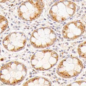 IHC检测Creatine kinase MT蛋白(货号 GB114800). 样品: 人结肠癌, 4%多聚甲醛 (货号G1101) 固定12-24小时. 抗原修复: 柠檬酸抗原修复液(干粉, pH 6.0) (G1201), 98℃, 20分钟. —抗: 1: 1000稀释, 4℃ 孵育过夜. 二抗: HRP标记山羊抗兔IgG (H+L) (货号GB23303), 1: 200稀释, 室温孵育1小时. |