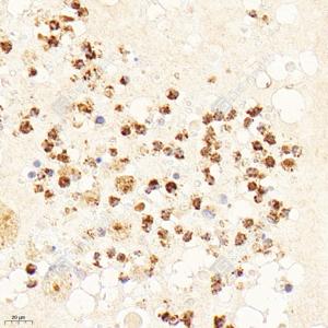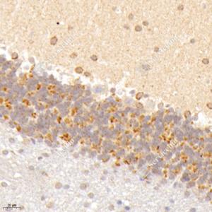 IHC检测Creatine kinase MT蛋白(货号 GB114800). 样品: 大鼠脑, 4%多聚甲醛 (货号G1101) 固定12-24小时. 抗原修复: 柠檬酸抗原修复液(干粉, pH 6.0) (G1201), 98℃, 20分钟. —抗: 1: 1000稀释, 4℃ 孵育过夜. 二抗: HRP标记山羊抗兔IgG (H+L) (货号GB23303), 1: 200稀释, 室温孵育1小时. |