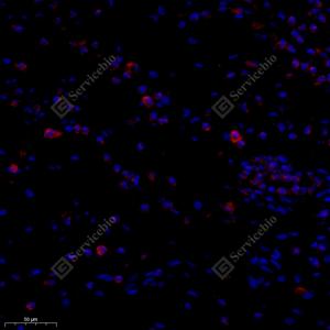 IF检测Creatine kinase MT蛋白(货号 GB114800)(红色). 样品: 人食管癌, 4%多聚甲醛 (货号G1101) 固定12-24小时. 抗原修复: Tris-EDTA抗原修复液(pH 9.0) (G1203), 98℃, 20分钟. 封闭: 3% BSA(货号GC305010)的PBS溶液, 室温孵育30分钟. —抗: 1: 300稀释, 4℃ 孵育过夜. 二抗: Cy3标记山羊抗兔IgG (H+L) (货号GB21303), 1: 300稀释, 室温孵育1小时. |